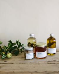 Building blocks for the considered pantry — a set of four kitchen staples from the Gjusta Goods collection, made in-house at Gjusta Bakery and packaged in a sturdy paper box for easy gifting.