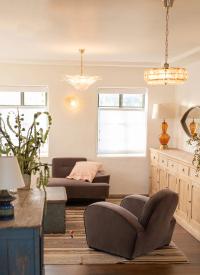 Living & bedroom include — Vintage furniture, mirrors and lighting, custom upholstered seating Board games & books Gjusta Goods linens