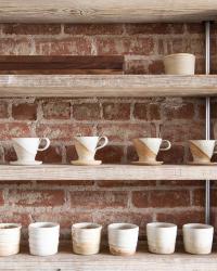 A stoneware + porcelain blend dripper with pier base glaze. Handmade by Whiskey + Clay in New Mexico for use in making pour-over coffees.